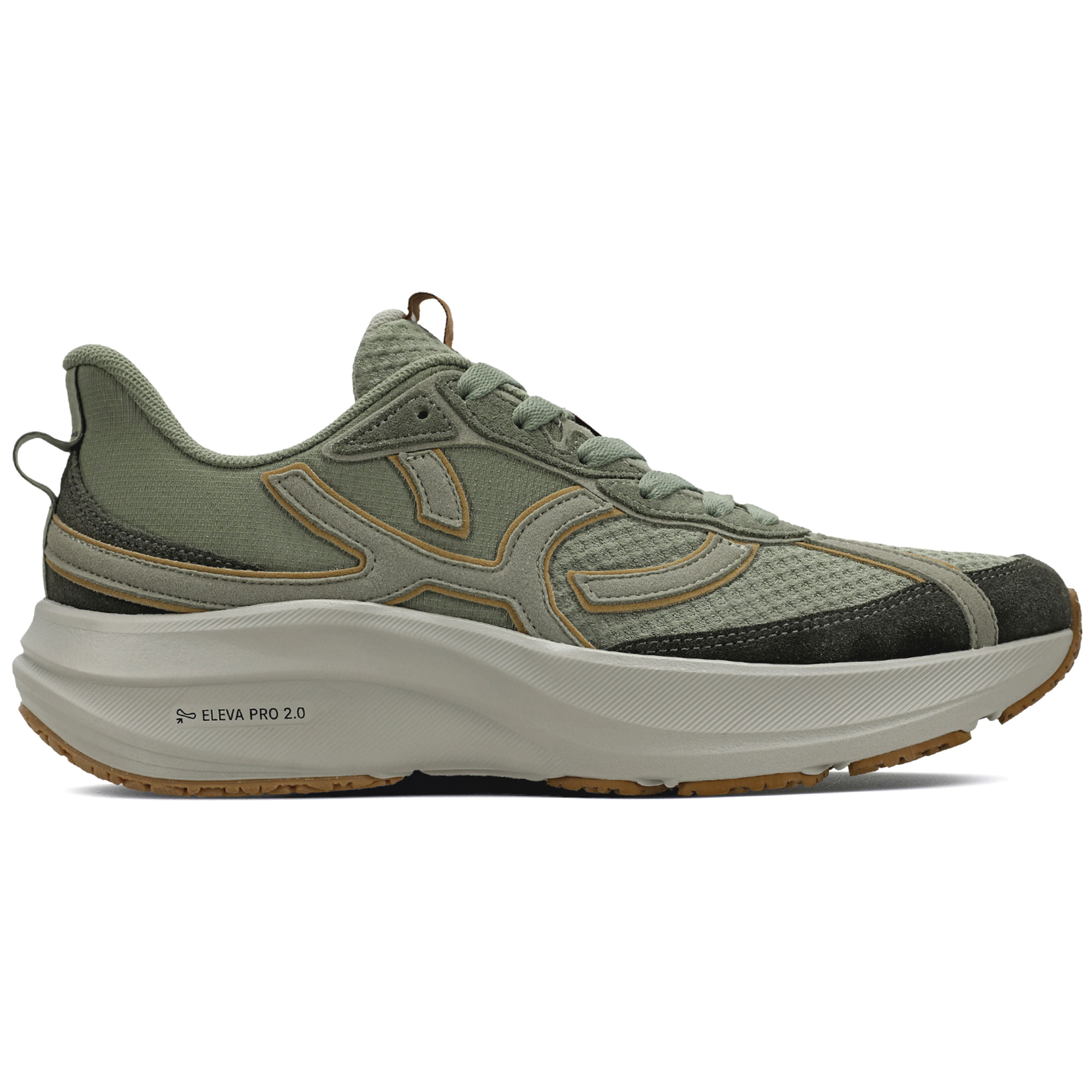 Gáspea elaborada com tecido em formato de favo composto por poliéster e elastano, traseiro em tecido ripstop quadriculado e vista em eco suede com camada sobreposta de camurça. O logo OLYMPIKUS e demais peças sobrepostas são aplicadas com materiais diferenciados como o suede e a camurça, que possuem textura macia e aveludada, proporcionando uma sensação de maciez e conforto. Lingueta confeccionada em tecido com formato de favo por uma mescla de poliéster e elastano, possui etiqueta bordada com o logo Olympikus. Atacador em fio poliamida com textura, garantindo uma amarração firme e visual aveludado. Forro em tecido poliéster oferece um maior conforto durante o uso. Puxador traseiro em fita foi projetado para facilitar o calce, tornando a experiência ainda mais confortável. Palmilha conformada composta por tecido poliéster resistente e transpirável e EVA para evitar a absorção de líquidos, conta com perfuros para reduzir seu peso. Solado com entressola que possui a tecnologia ELEVA PRO 2.0 que melhora os índices de resiliência e conforto. A nova versão da borracha GRIPPER PLUS garante firmeza no contato com o chão, sua nova formulação possui uma resistência à abrasão superior em 40% e 50% a mais de resistência ao deslizamento (Grip), garantindo mais segurança e durabilidade do solado.